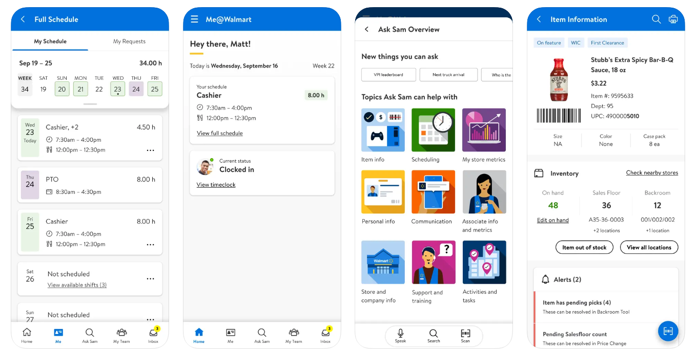 沃尔玛希望能够为员工打造一个理想的工作场所,并且就在今年推出了一款名为Me@walmart 的全新一体化APP。Me@walmart APP能够解决员工的所有需求,它包括员工的日程安排、上下班打卡、融合Ask Sam人工智能功能、工作交流以及快速扫描上架商品等等。该应用程序将持续增添新功能,让员工能够更加轻松地完成工作。