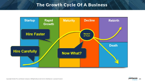 公司和人一样,也会经历成长周期。在早期阶段,通常在投资者的推动下,公司发展迅速。头几年的收入很容易翻一番或翻三番,这就产生了招聘需求。因此,快速增长的公司将招聘放在首位,尽可能快地吸引最优秀的工程师、最优秀的营销人员和最优秀的销售人员。
