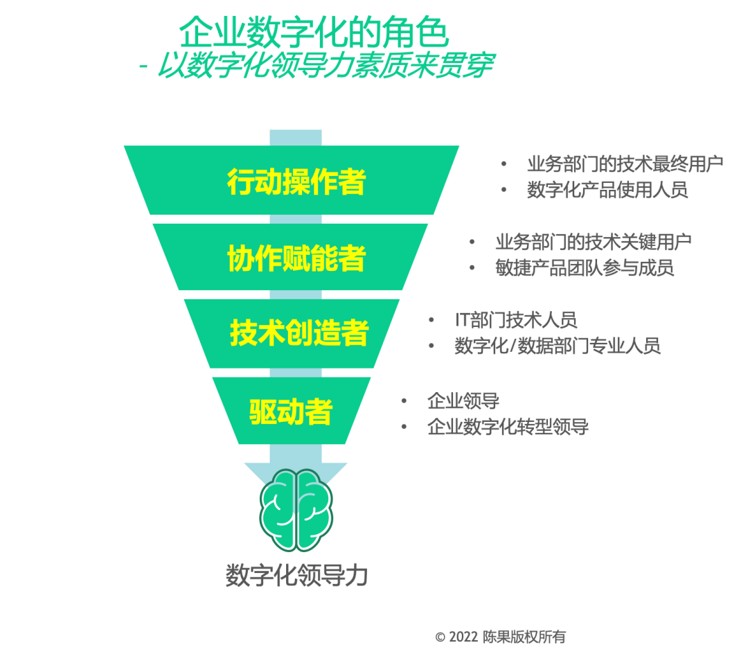 我将数字化人才根据企业内的组织定位分为四类(如下图),即领导层、技术层、赋能层和操作层,除了每层中岗位特定要求的数字化相关的知识、技能和能力外,共性的数字化相关的特质(traits),提炼出来就是“数字化领导力”: