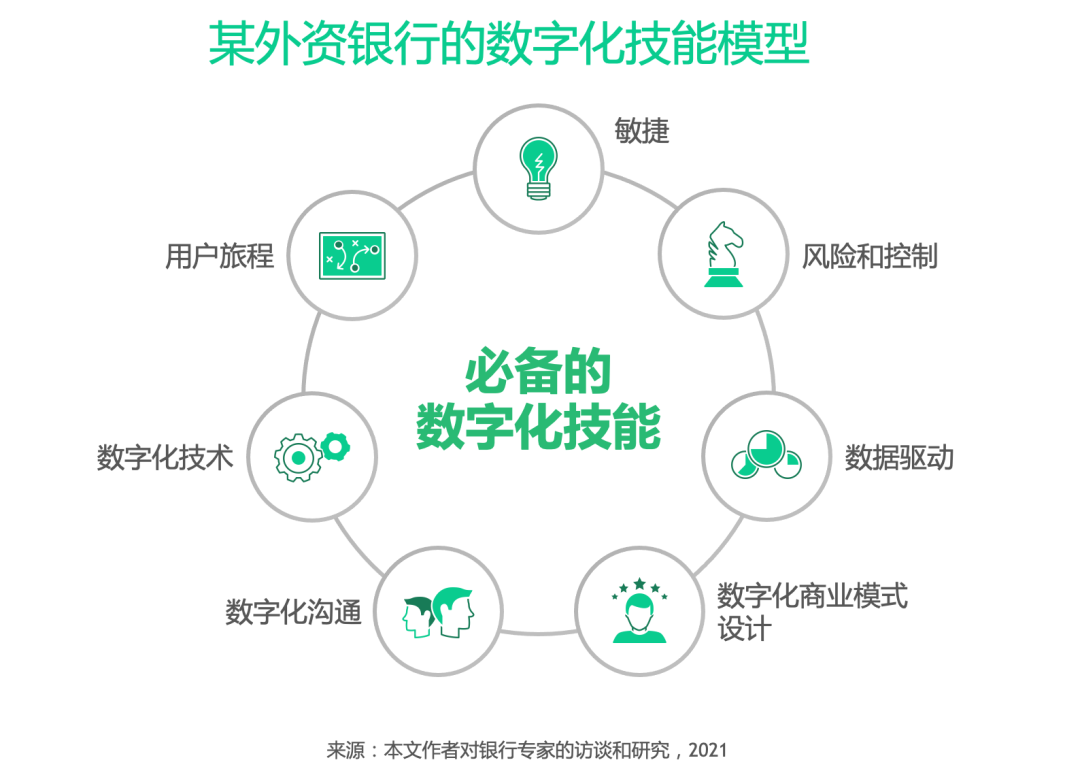 基于行为可以总结出能力素质模型,作为评价“数字化人才”的评价标准,而这些标准的观察指针和评定锚点,则是相关的典型事件和行为。下图是某外资银行的数字化技能的评价模型: