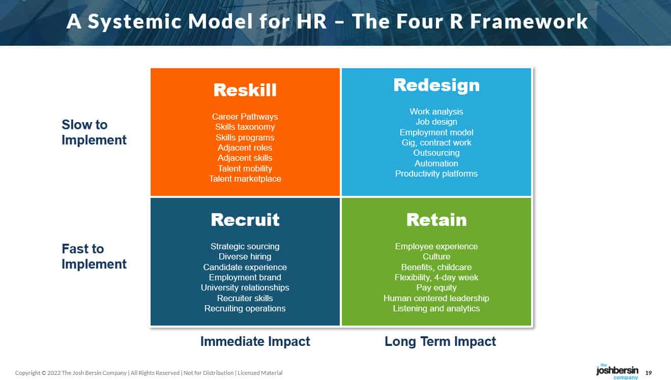 在“少花钱少办事”的主题下,人力资源部门今年将更加整合。我们的四 R 模型(招聘 | 保留 | 再技能 | 重新设计 –全球劳动力智能项目的一部分)正在获得好评如潮,这一切都是关于将人力资源视为一个“操作系统”,而不仅仅是一堆提供服务的专业知识中心。我们将在明年为您详细介绍这一点,所以请来《不可抗拒的 2023》听听详情。