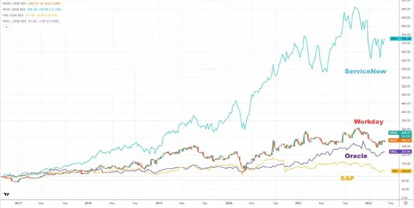 其实股市最能说明这一点,看看三大 ERP(Workday、Oracle、SAP)与 ServiceNow(员工体验平台的领导者)的相对价格图表。他们都是由优秀的管理团队经营的尖端科技公司,只是在不同的细分领域。