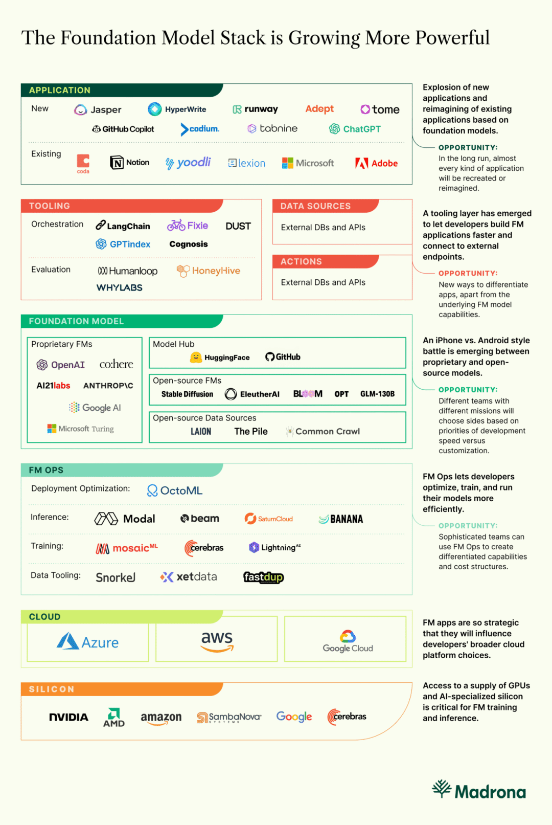 例如,像 Salesforce 和 Workday 这样的公司非常依赖于他们现有的用户界面,他们常常“害怕”破坏他们自己的系统。如果我们有一个 Salesforce.com GPT 前端,就可以轻松地将它附加到 Hubspot。因此,可能会有新的供应商构建这些新系统,从我们喜爱的平台访问 API 和数据。这也标志着生成式 AI 工具“堆栈”日益深入。