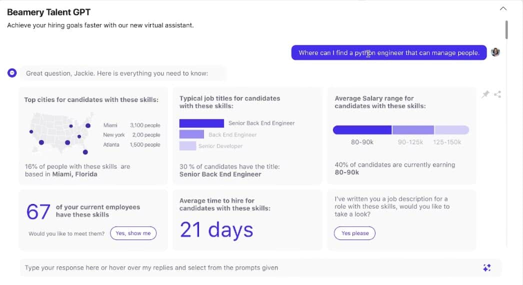 试想你正在寻找一名软件工程师,并给TalentGPT(Beamery 的名字)提出要求,随后系统会提出一系列问题以优化你的请求。