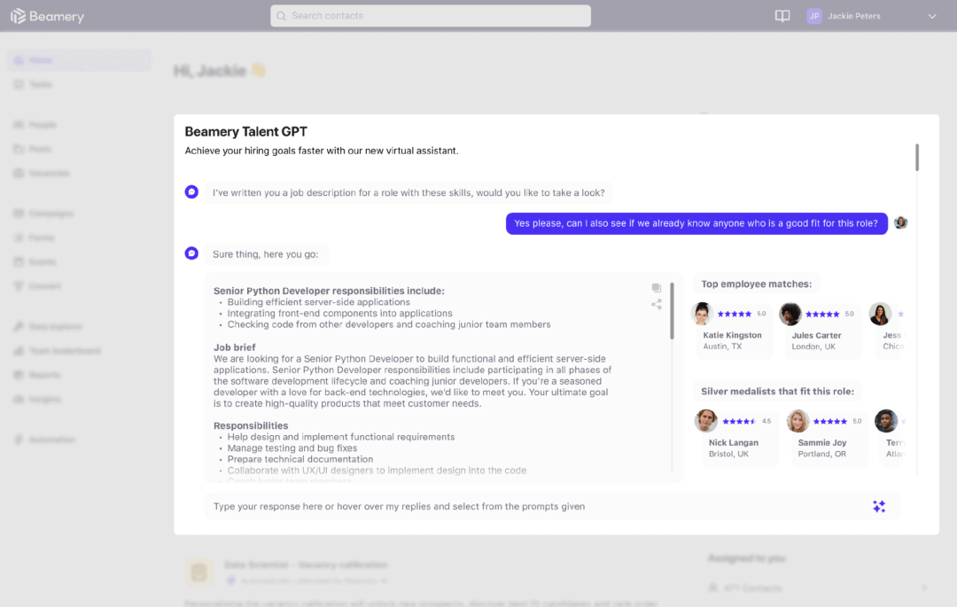 一旦进行进一步的优化搜索,后端系统(使用Beamery AI 模型)可以向你展示优化过的候选人,帮你选择最合适的人选。(Beamery 的 AI 模型是经过偏差调整的,而开箱即用的 GPT并没有。作为招聘机构,您可能要对 AI 引起的偏差负责,供应商们也需要注意这一点)。