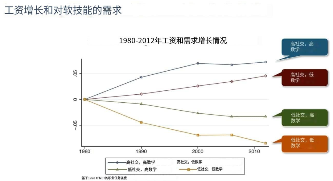 你可以看到,在这22年中,具有社交技能(即管理、领导、沟通、销售、时间管理等)的员工收入远高于那些技术人员。