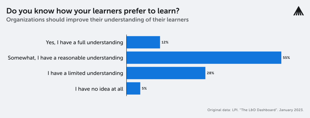 培训项目的总体成果取决于员工个人学习体验的集合。通过以员工为中心并优化每一次学习体验,企业可以提高培训计划的效率并更接近其目标。这是以员工为中心的学习文化的核心原则是促进个人成功,推动组织发展。企业可以将该文化贯穿员工从入职到离职的整个培训生命周期,以最大限度地提高他们的学习体验。此外,为了提供以员工为中心的学习体验,企业必须花时间了解每个员工的角色以及他们的具体需求和挑战。这涉及发现他们的学习偏好、职业抱负以及对组织的潜在贡献。LPI的数据发现,只有 12% 的组织完全掌握员工喜欢的学习方式,这一数字强调了学习体验必须全面改进的必要性。