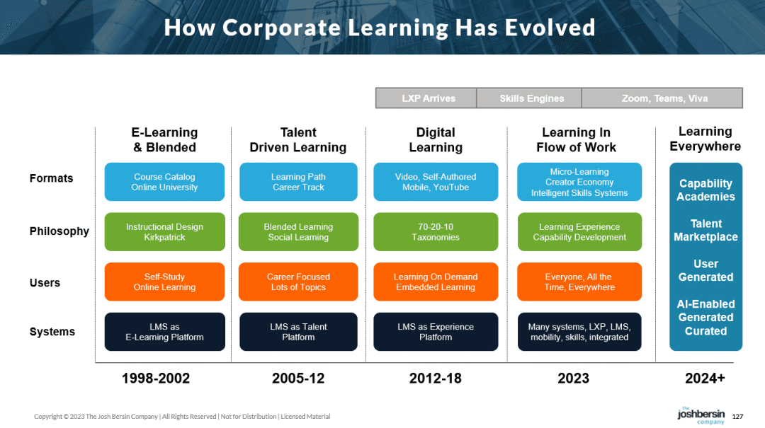 但是,让我给你留下另一个思考。正如我在过去所写的《企业学习的创作者市场》中提到的,许多正规培训公司低估了自主创作内容的增长。大多数传统的培训出版商(如LinkedIn Learning、Skillsoft、Pluralsight,甚至我们的Josh Bersin Academy)倾向于围绕自己的专业知识优化解决方案。
