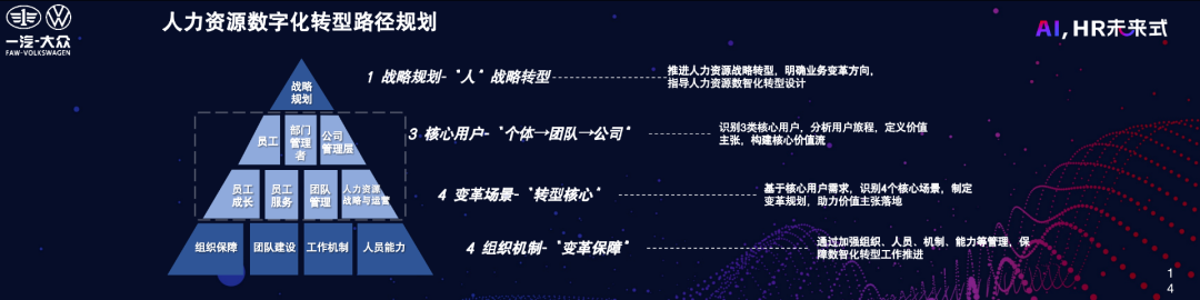 最上面金字塔尖的1是战略转型的理念。3是聚焦于三类核心用户,包括员工、各级部门和团队的管理者以及公司的管理层。4是针对这三类用户识别了四个场景,分别是员工成长、全生命周期的员工服务;部门管理者的团队管理诉求、公司管理层的整体人力资源战略与运营。金字塔的底座是人力资源体系内部,从组织、团队、机制和人员能力四个方面为数字化转型的规划提供保障和支持。