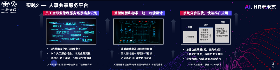 第二个实践是人事共享服务平台,与员工成长平台有所不同,该平台主要服务于员工全职业场景下的各类需求,包括入职、调转、离职、退休等手续办理,证明开具,劳动合同续签以及办公用品领取等。