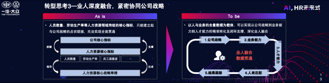 过去,我们的工作主要围绕公司用户开展,试图满足其对人力资源的需求。然而,工作方式并不一定有效。我们通常从公司的核心指标出发,拆解人力资源的核心指标,并使用这些指标来指导人力资源业务,以促进人力资源指标的达成,进而支撑公司核心指标的达成。这是一个看似良好的闭环。未来,数字化为我们提供了机会。通过以人和业务的全量数据为载体,我们可以考虑从公司的战略方向推导出业务能力的需求,进而确定对人才能力的需求。