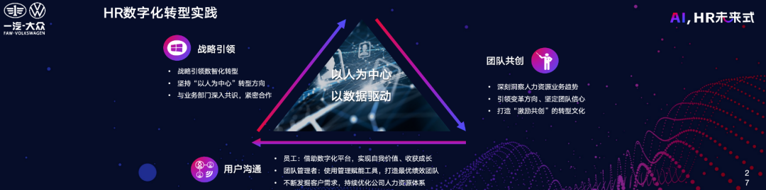 第二个是团队共创。人力资源部门在进行数字化转型时,牵头者需要在推进过程中深刻洞察环境趋势、引领变革方向、坚定团队信心,打造团队“激励共创”的转型文化,持续在人力资源内部扩大影响力。