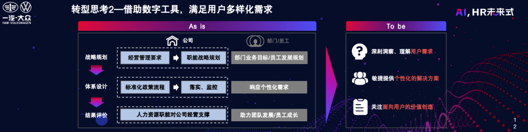 现在,普遍认为人力资源有三类用户,包括企业、员工和业务部门。过去,我们更多地关注企业这一用户,而忽略了员工和业务部门的需求。未来,为了实现以“人”为中心的转型,我们需要进行思路的转变,用户不只有一个,而是三个用户。同时,我们需要借助数字化工具,实现“千人千面”的人力资源成长方案的设计。