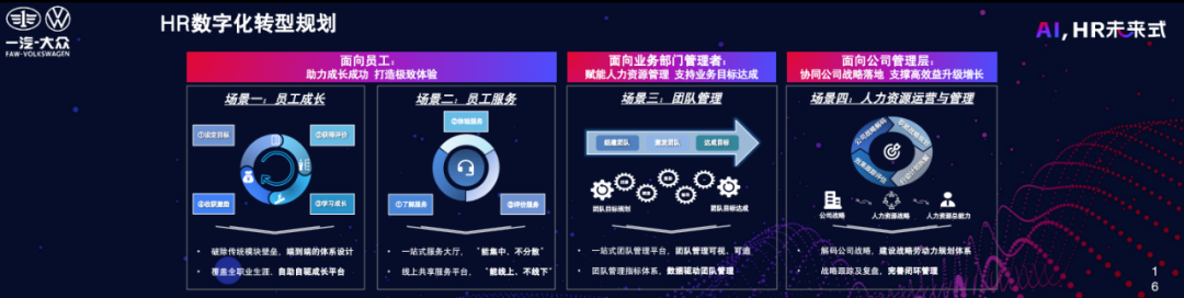 针对这四个场景,我们已经初步规划了蓝图。对于员工成长方面,我们希望以员工为中心,设计端到端的员工成长一体化方案。为了打破原有的选任用留和六大模块的职能限制,我们真正从员工的视角出发,考虑他们对自己的职业生涯有何规划。针对员工的差距,我们提供针对性的成长和提升方案。经过成长提升后,员工能够获得激励和发展。我们围绕员工成长场景进行整体设计,以满足员工的需求和期望。