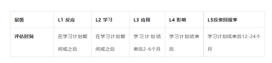 同样,你需要根据预算和业务需求来确定要衡量的级别。评估级别发生在不同的时间,如下表所示: