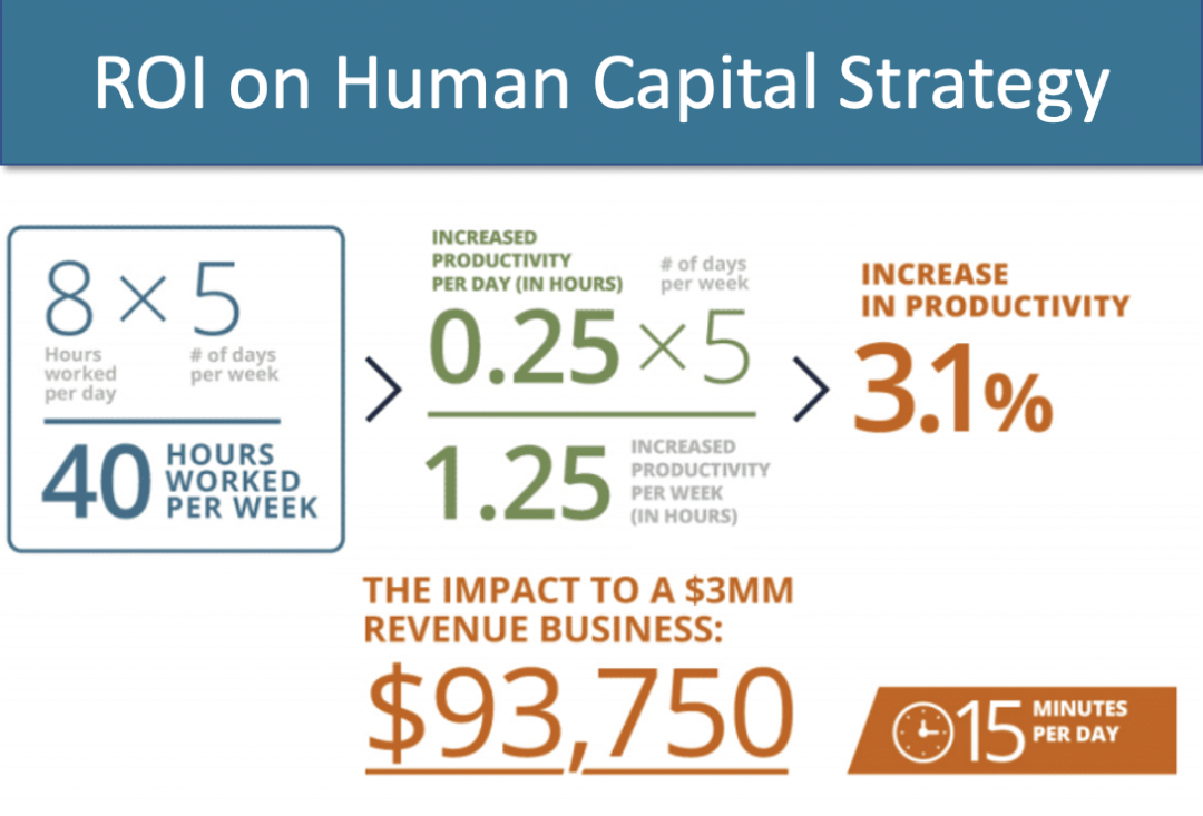 假设您在工作场所推出一项健康计划,费用约为 250,000 美元。这些是您的人力资本支出。您从该计划中节省的费用(减少压力、旷工、倦怠等)总计 700,000 美元。所以: