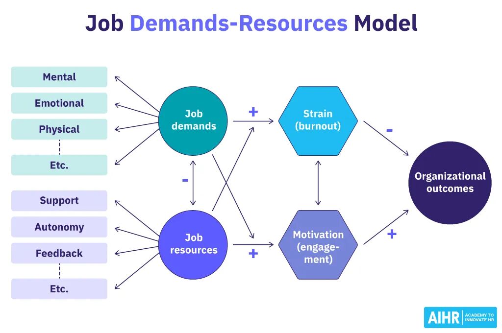 人力资源专业人员的主要目标之一是为员工提供必要的资源,以更好地表现。这也体现在下面的工作需求-资源模型中,该模型认为,高工作需求应该与足够的工作资源(如自主权、绩效反馈、社会支持和辅导)相平衡,以实现最佳的敬业度和绩效。