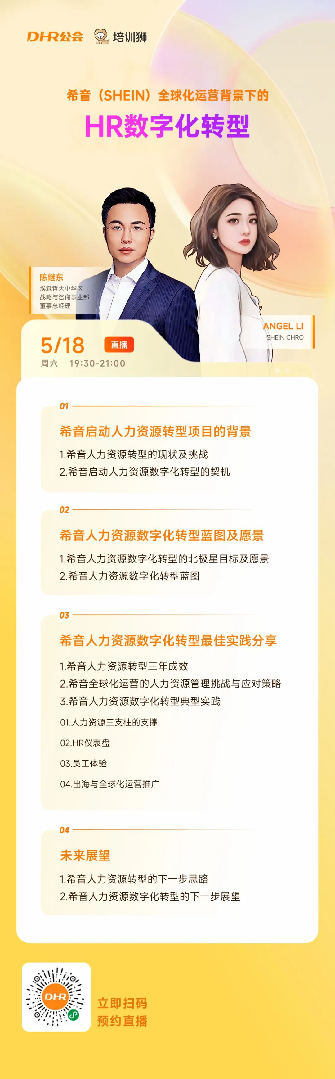5月18日,DHR公会邀请到了希音(SHEIN)的CHRO ANGEL LI与埃森哲大中华区战略与咨询事业部董事总经理做客直播间,与DHR公会创始人老申展开一场关于全球运营背景下的企业HR数字化转型的精彩对话。欢迎预约直播!