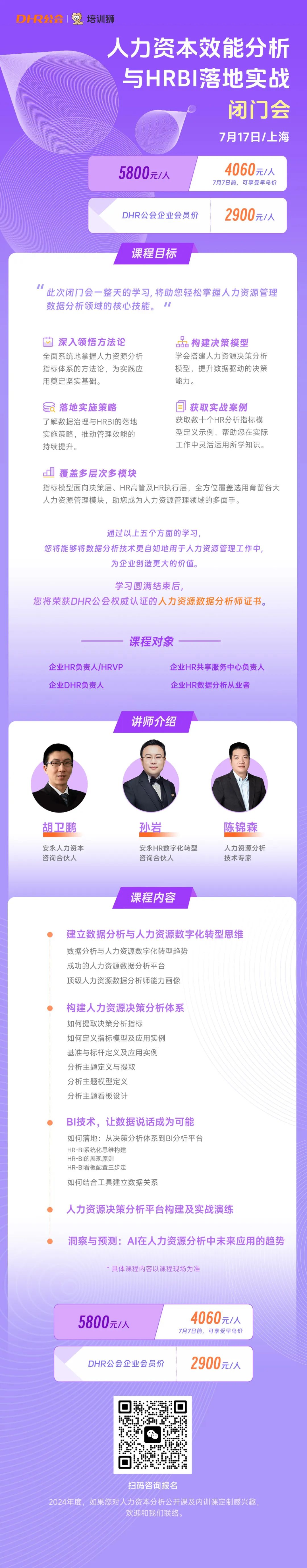 7月17日,我们将在上海启动一场“人力资本效能分析与HRBI”落地实战闭门会,帮助您在最短时间内掌握人力资源管理数据分析领域的核心技能,有意向者可扫码详细咨询。