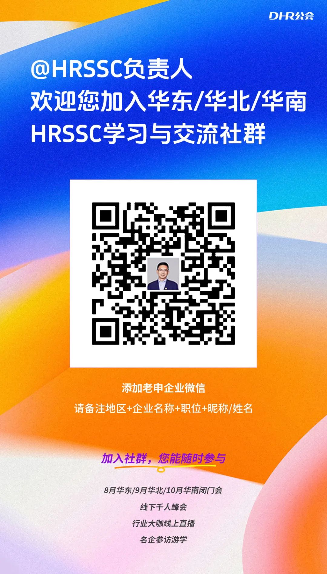 如果您对HRSSC系列的话题感兴趣,欢迎您添加老申企微申请加入社群。我们将定期组织闭门会、线下峰会、线上直播、企业参访等活动。