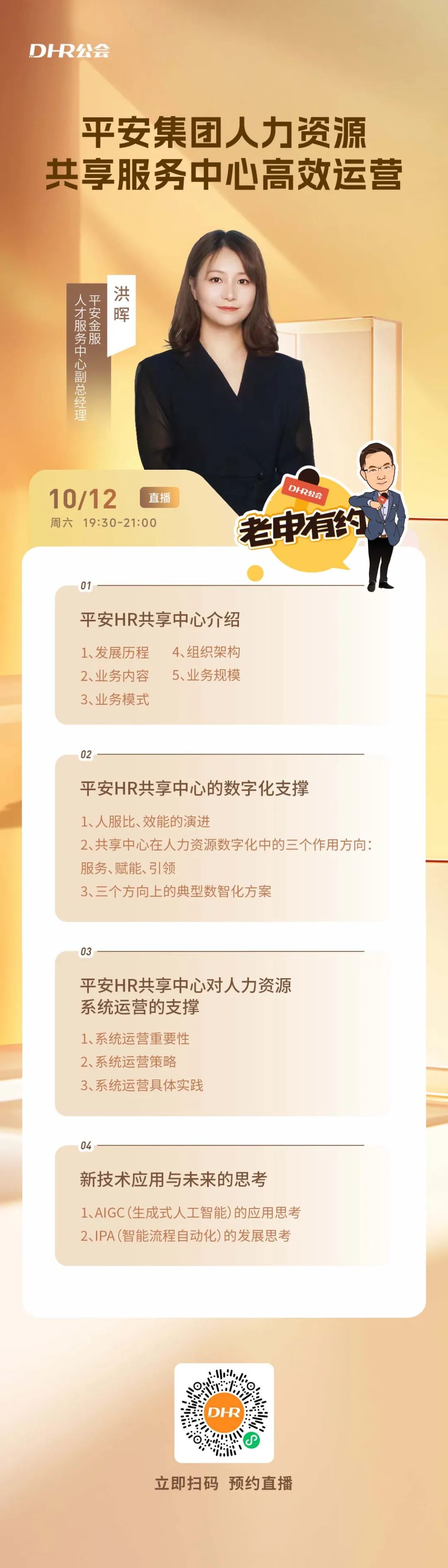 10月12日,平安金服人才服务中心副总经理洪晖女士将在DHR公会的直播间为我们线上分享“平安集团HRSSC高效运营”的主题,欢迎大家扫码提前预约。