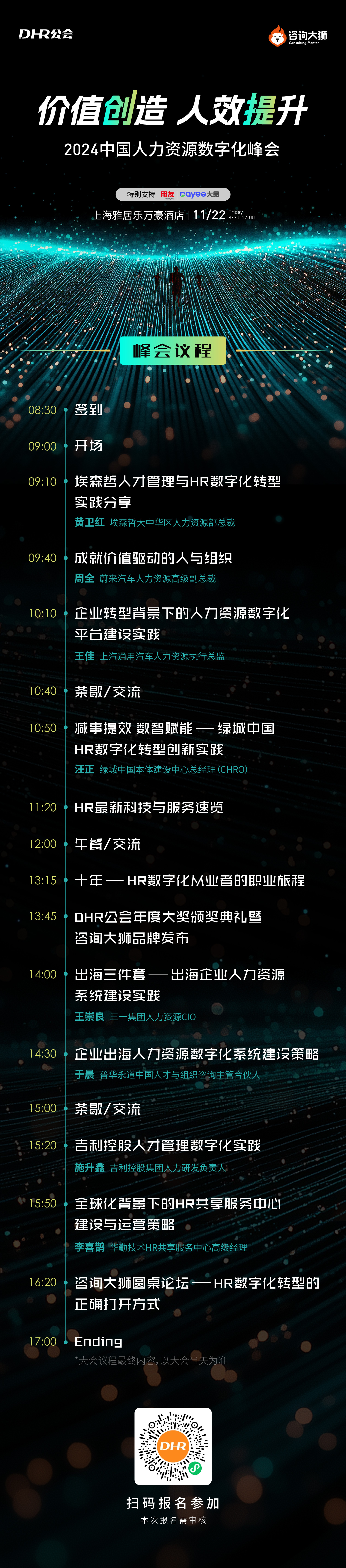 参会人士:企业CHO、DHR、HRSSC等HR各模块负责人、企业出海业务负责人及从事人力资源数字化、人力资源共享服务中心、中企出海相关工作的专业人士。