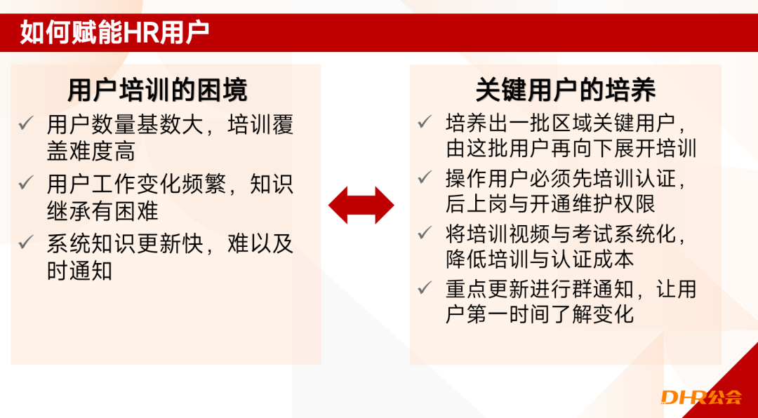 关键用户对本单位的HR和其他用户进行二次培训,通过前期信息收集,确保HR获得必要的赋能。