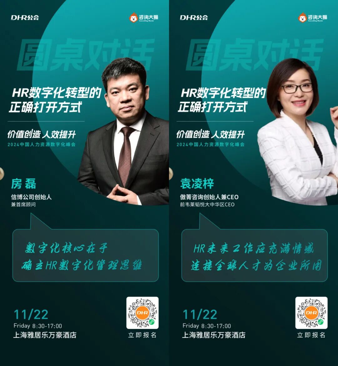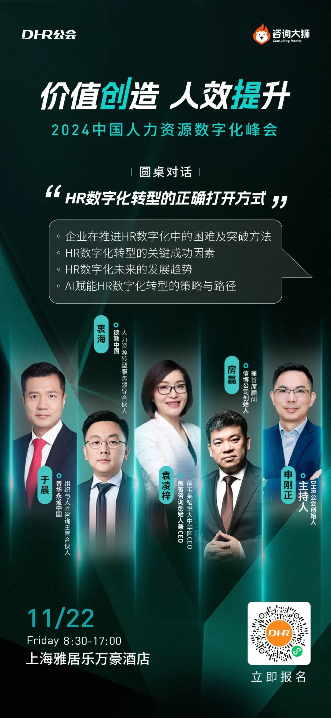 在这场年度盛会上,你将看到傲菁咨询创始人兼CEO/前韦莱韬悦大中华区CEO袁凌梓女士、普华永道中国组织与人才咨询主管合伙人于晨先生、德勤中国人力资源转型服务领导合伙人衷海先生、信博公司始创人兼首席顾问房磊先生四位咨询行业大咖与DHR公会创始人申刚正先生共同展开深度圆桌对话。
