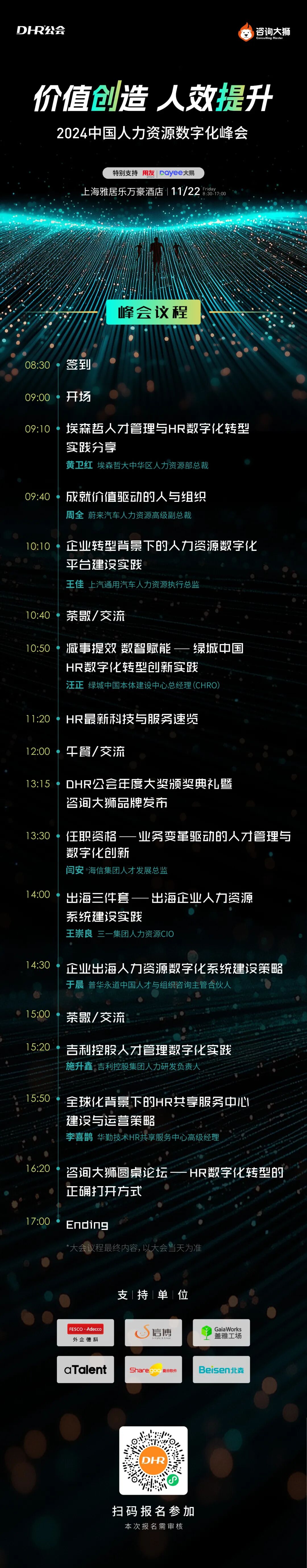 在这里,咨询大咖们将现场分享他们在HR数字化转型领域的独到见解和成功经验,带来前瞻性观点和战略性指引。您将获取关于如何有效实施HR数字化转型的实用策略、最新技术趋势以及成功案例分析。
