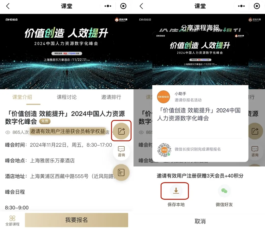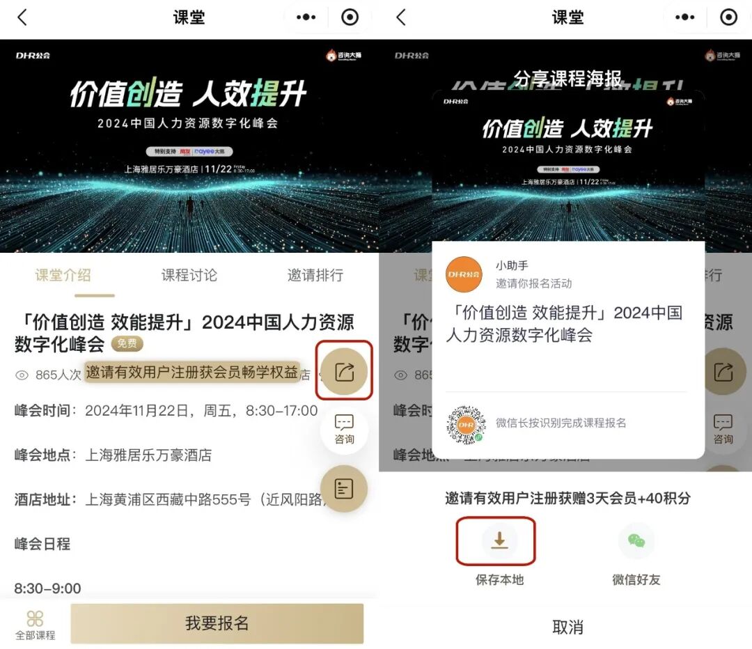 步骤2:保存邀请海报,发送给被邀请用户或者转发至朋友圈,被邀请用户成功报名峰会后,才会被系统记录;