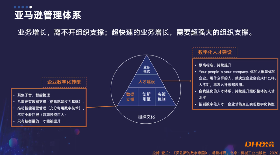 书中明确定义了亚马逊的管理体系,以一个圆形三角形为核心,顶端是业务模式,下方则包括人才培养和数据支持,同时涵盖创新引擎和决策机制,这一体系围绕着组织文化构建而成。