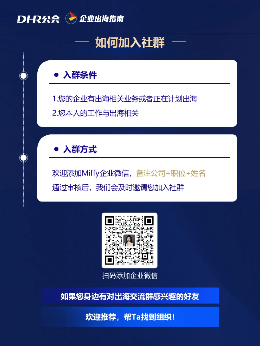 我们正在组建「中企出海交流群」。如果您的企业有出海相关业务或正在计划出海,又或者您本人工作与出海相关,欢迎您添加DHR公会运营负责人Miffy企业微信,备注公司+职位+姓名。通过审核后,我们会及时邀请您加入社群!