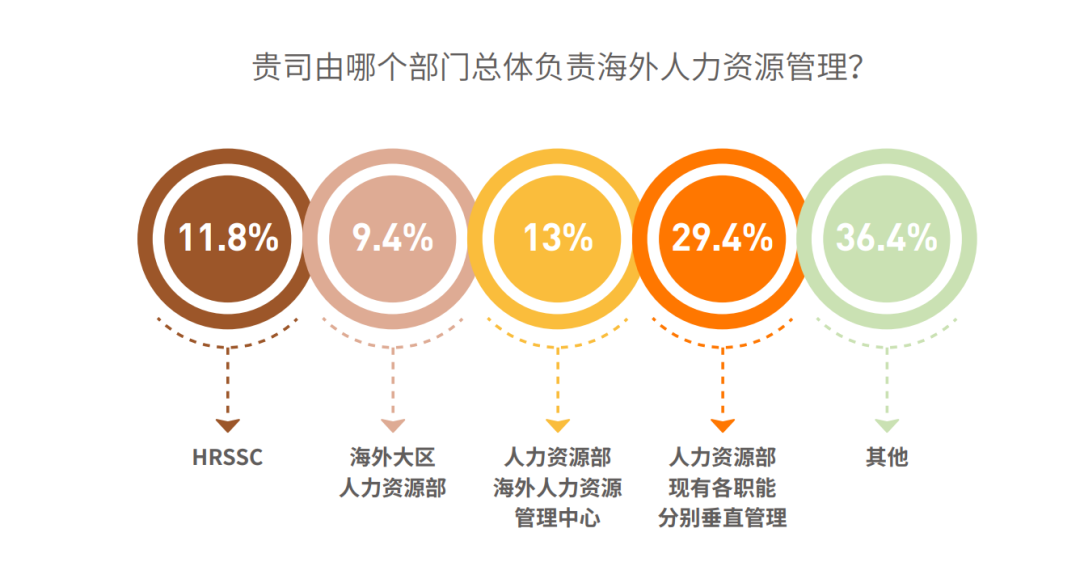 29.4%企业海外HR管理负责部门由人力资源部现有各职能分别垂直管理,这说明分散管理模式依然存在,各职能部门独立管理海外人力资源,以应对多样化的市场环境和法规。