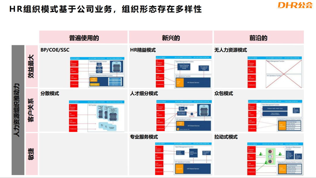 孙老师:您提到的组织模式与我之前介绍的8种组织架构中提到的SDC(Shared Delivery Centers)角色相似。SDC并未与COE和BP放在一起,而是独立运作。